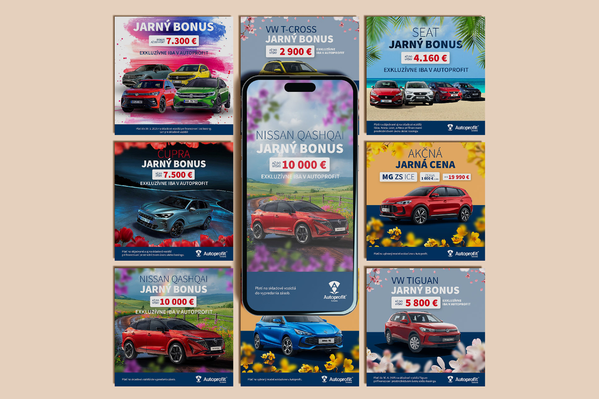A series of graphic banners created for Autoprofit to promote spring bonuses and special car offers on social media.